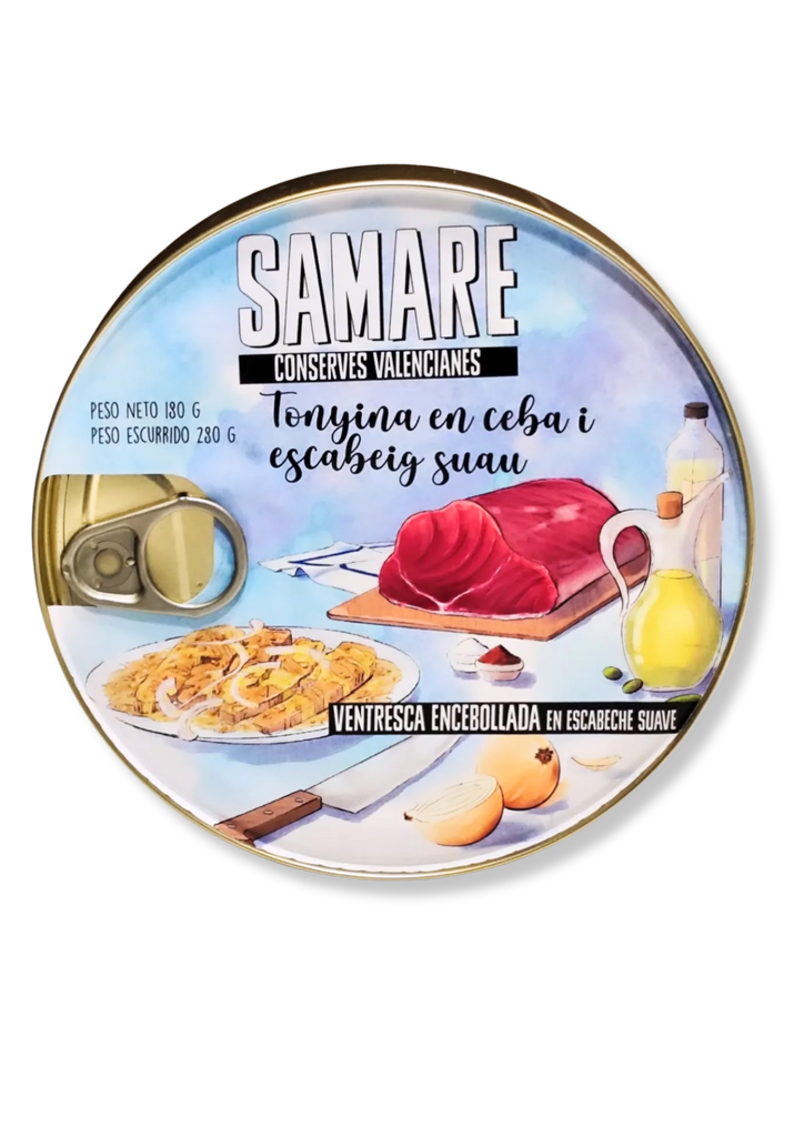 Disfruta de una de las preparaciones marineras más exquisitas del Mediterráneo: la ventresca de atún elaborada artesanalmente por Conservas Samare, una marca valenciana especializada en recetas tradicionales de gran calidad.